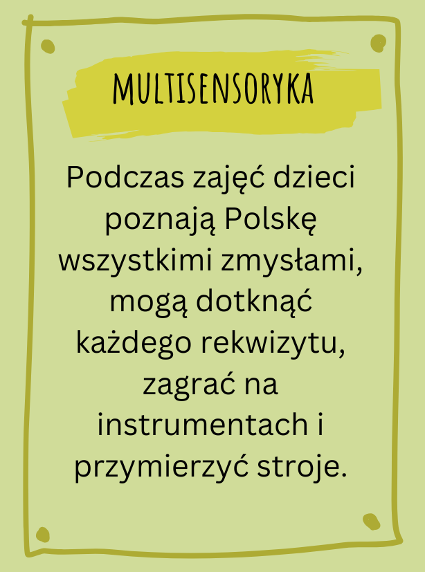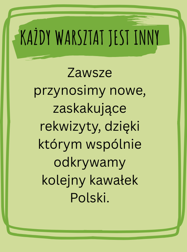 Większości z nas wydaje się, że Polska nas nie zaskoczy, a jednak! Na warsztatach Palcem Po Mapie przekonamy się, że to co najbliższe nas jest prawdziwym skarbem. Na każdym spotkaniu uruchomimy zmysły, żeby jeszcze bardziej doświadczyć folkloru i różnorodności, którym przepełniona jest nasza Ojczyzna. Będziemy oglądać nieznane dotąd zakątki naszego kraju, dotykać endemicznych artefaktów, będziemy eksplorowali, co kryje wnętrze ziemi, powąchamy przypraw, będziemy mogli dotknąć prawdziwych minerałów – tych, które wydobywamy do dziś i tych sprzed wielu epok. Poczujemy smak prawdziwej polskiej przygody, która przyfrunie do nas przez dźwięki zwierząt i tradycyjnej muzyki. A jakby tego było mało? Zagramy na regionalnych instrumentach, będziecie mogli przebrać się w prawdziwe stroje ludowe, a także doświadczyć zabaw swoich pradziadków. Wow! Na każdym zrobi to duże wrażenie – na dzieciach, nastolatkach i dorosłych!